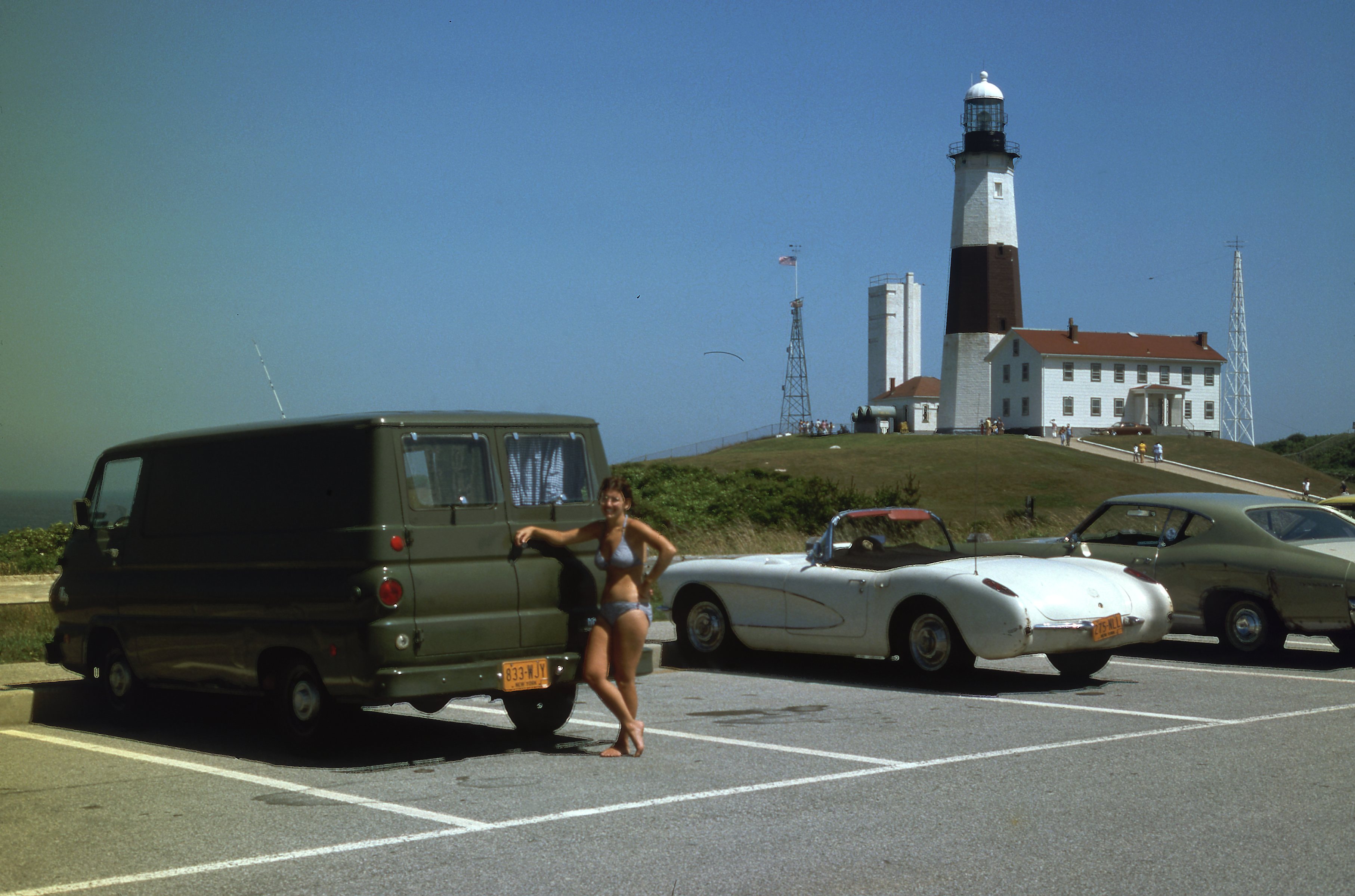 Next morning, we learned that if you are a bona fide fisherman, you could spend overnight at the Montauk Point state parking lot. We went to a fishing gear store, bought a saltwater rod and a few lures, and a paper bag. We became bona fide fishermen. We even tried fishing, but the rocks ate most of the lures. That night, as we attempted to sleep virtually alone in a massive parking lot, some kind of weather front passed over us accompanied by thunder, lightning, heavy rain, and wind. It blew so strong that the van rocked on its worn suspension, striking fear that it might tip over or be blown into the sea. That may have been the end of my run as a bona fide fisherman. I decided to sell the rod.